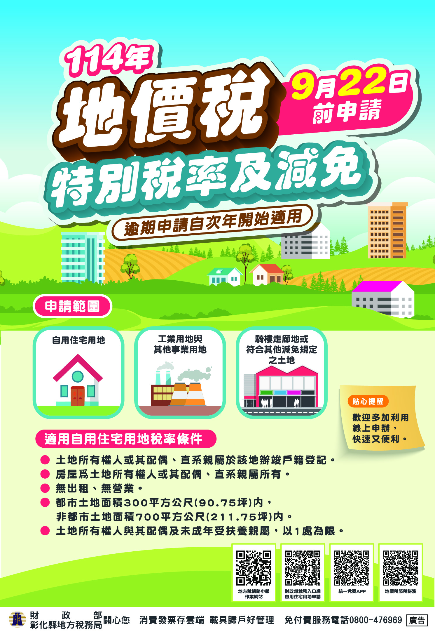 114年適用地價稅特別稅率及減免,請於9月22日前提出申請當期即適用,逾期申請自次年開始適用,彰化縣地方稅務局關心您。