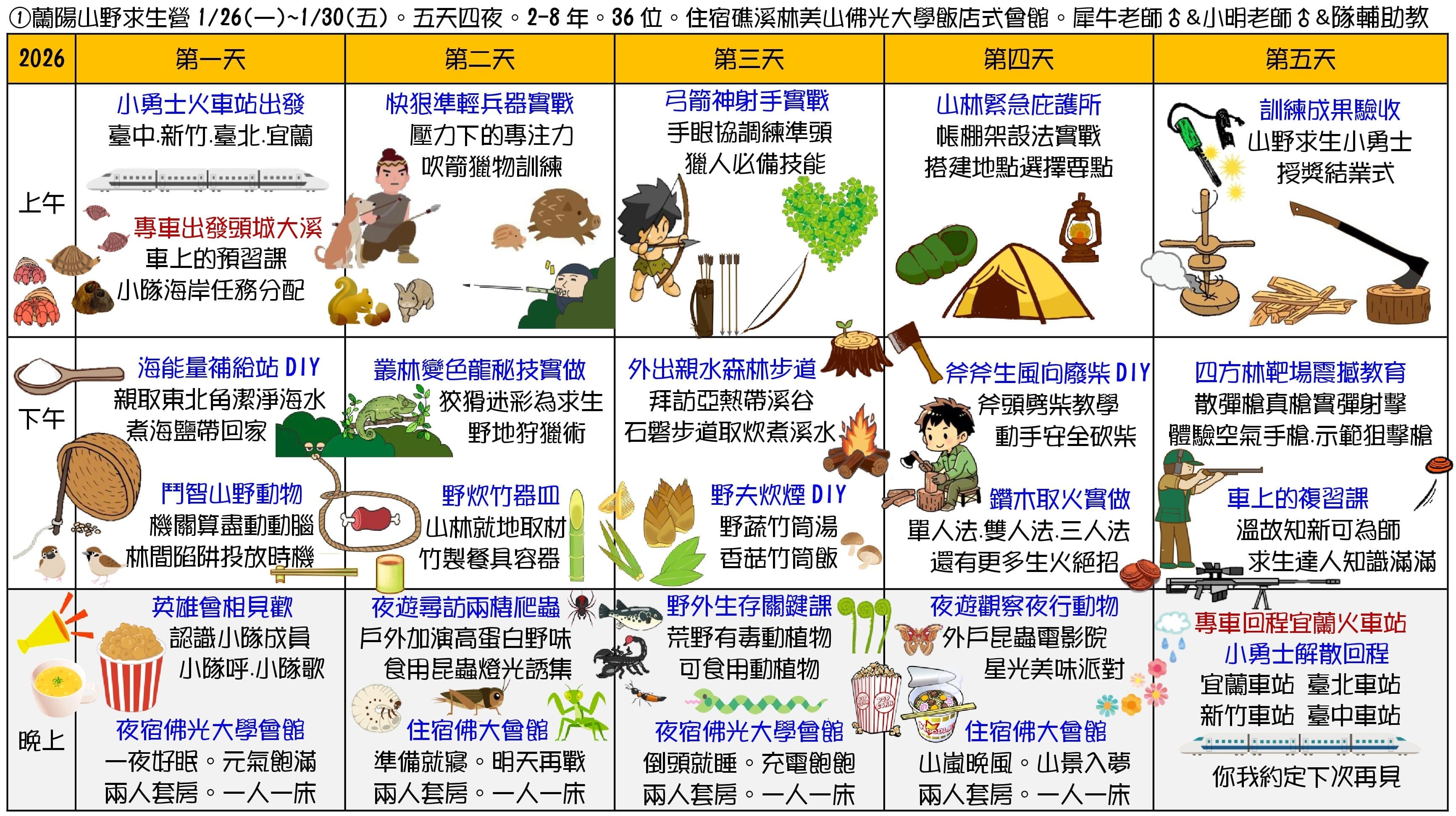 | 二、 | 課程主題:①蘭陽山野求生營(5天4夜)、②小琉球海龜營(5天4夜)、③宜蘭生態農場營(3天2夜)、④TPE博物館生態營(3天外出不過夜)、⑤屏東柚園攀樹營(3天外出不過夜)、⑥節肢小怪獸營(3天大學不過夜)、⑦池上單車生態營(4天3夜)。 |