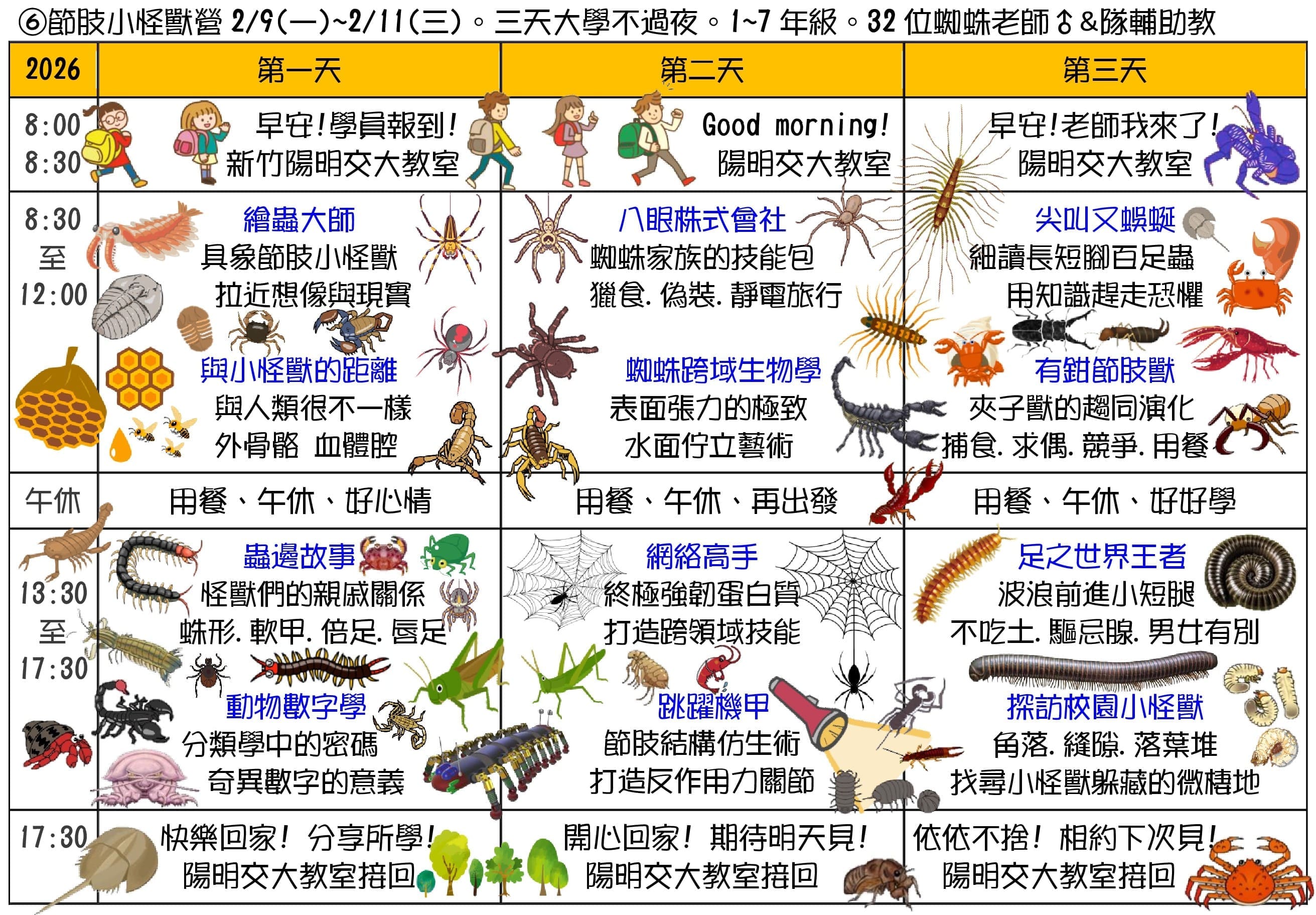 | 說明: | 愛上大自然文教將於115年寒假辦理【大樹聚 島航去】2026生態素養冬令營共七個梯次,暨參展2026第七屆臺灣國際昆蟲博覽會活動。 |
