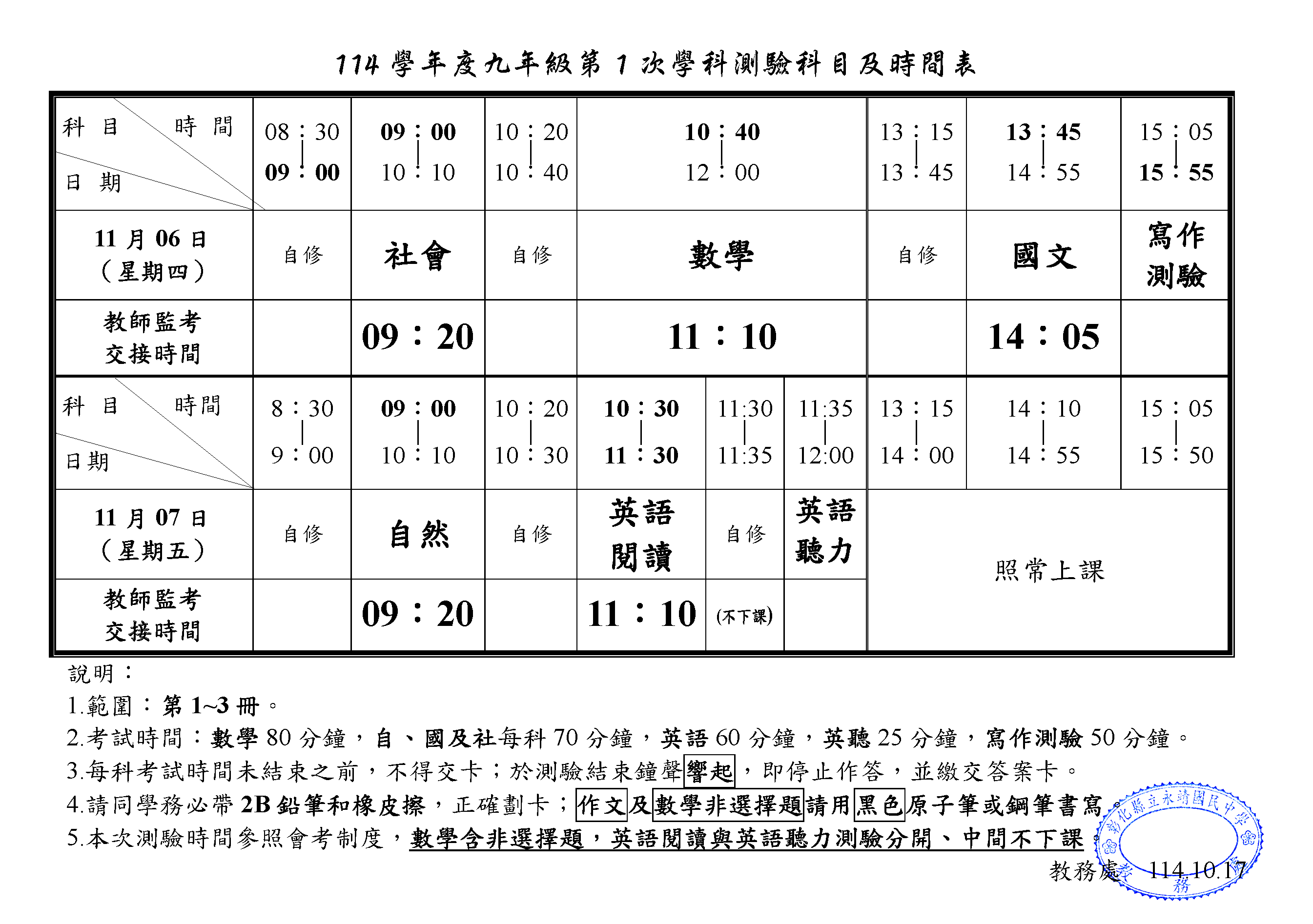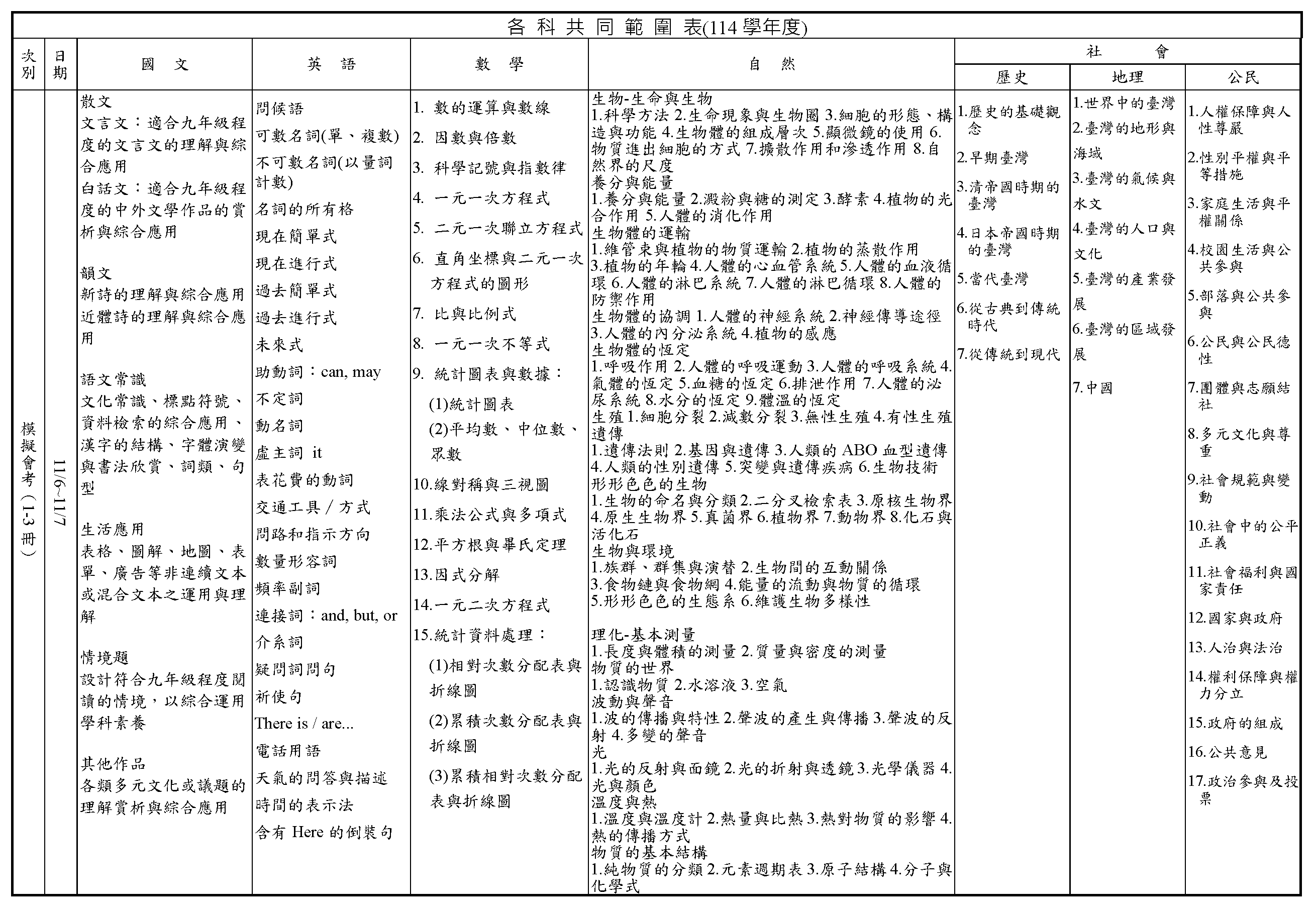 114學年度9年級第1次學科測驗科目、時間及範圍表
