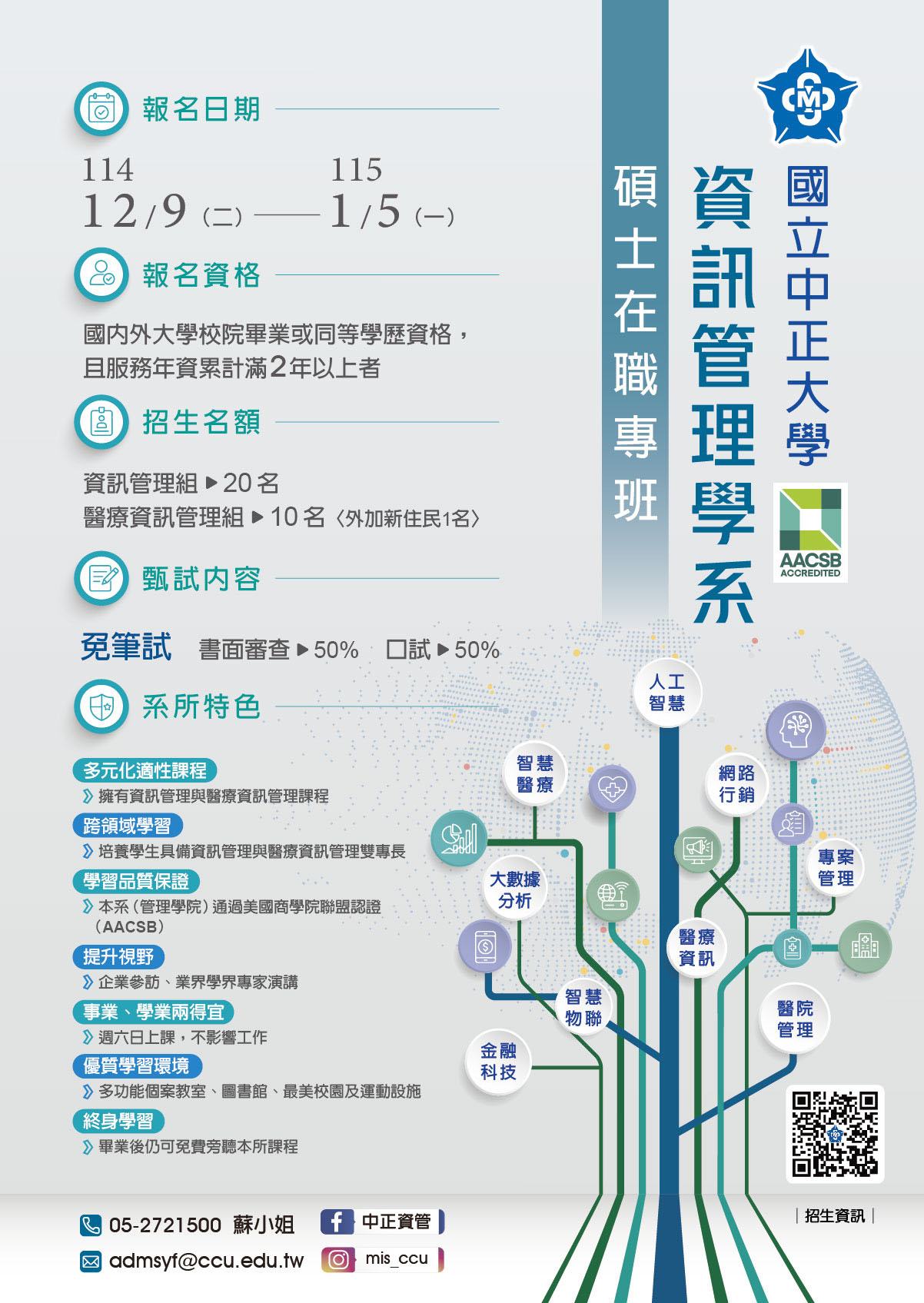 轉知國立中正大學「資訊管理學系碩士在職專班」115學年度招生資訊