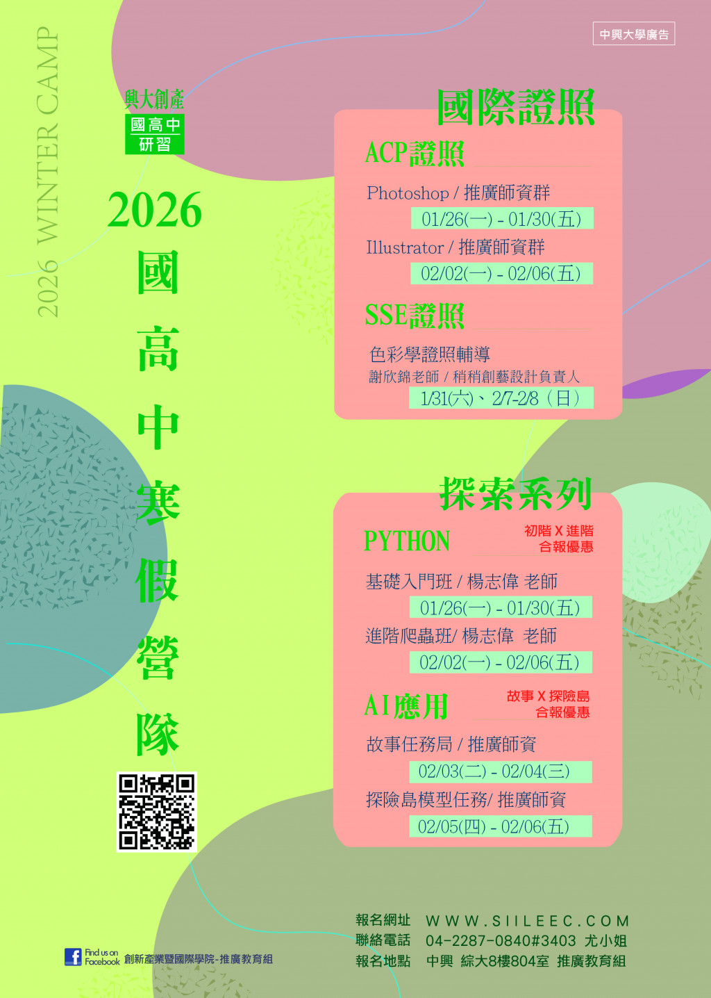 Python程式設計系列、ACP與SSE色彩學國際證照輔導、AI應用故事 X 探索島系列招生海報與簡章