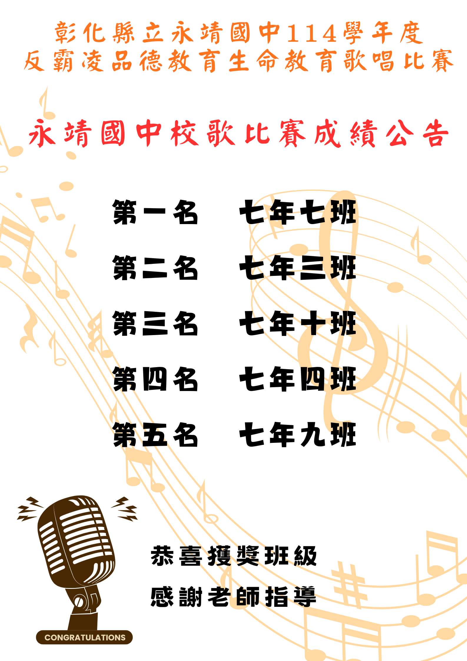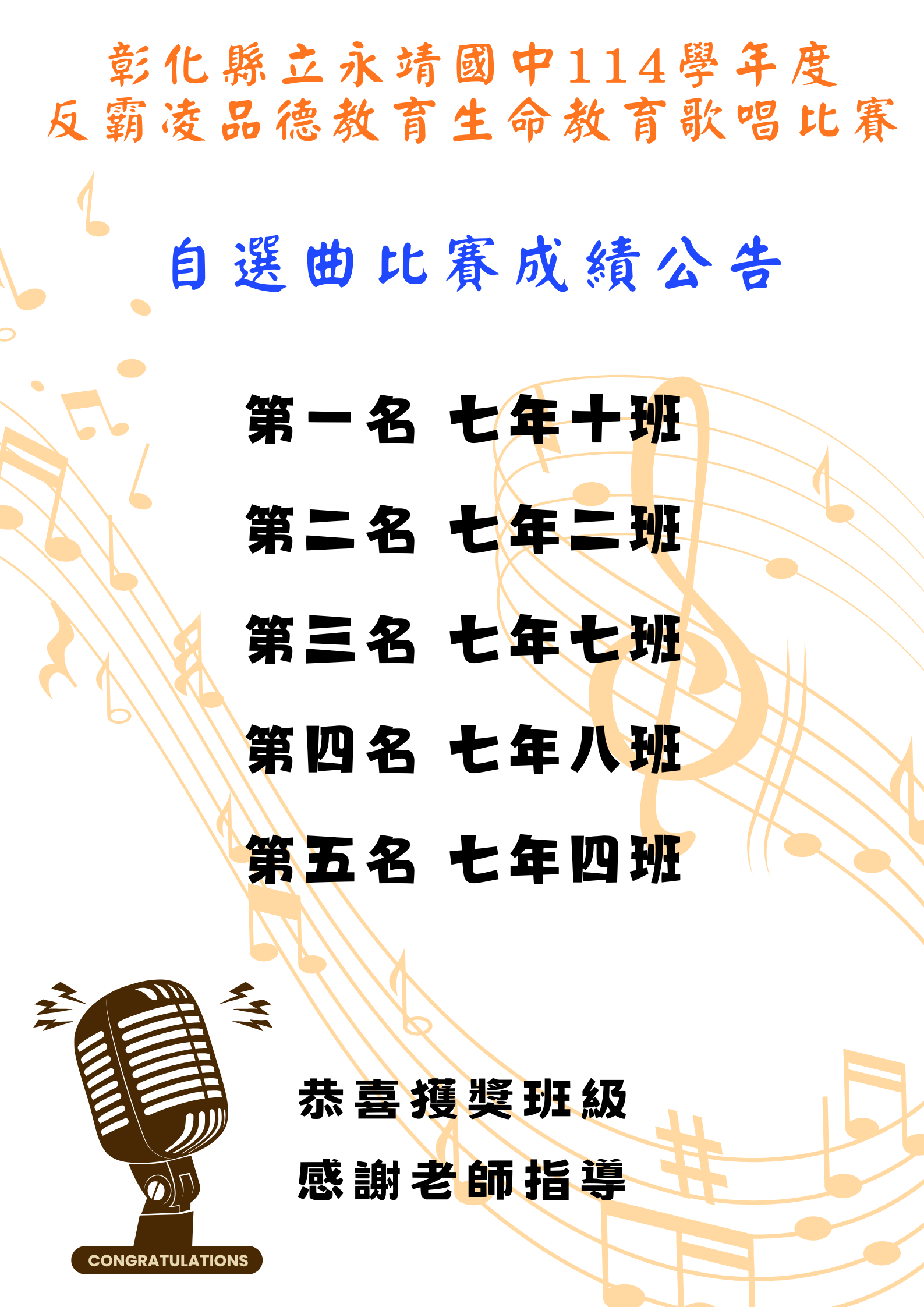 永靖國中114學年度反霸凌品德教育生命教育歌唱比賽成績公告