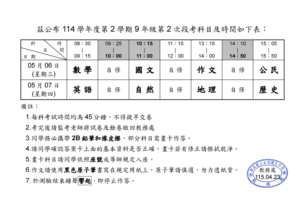 114學年第2學期9年級第2次段考時程表